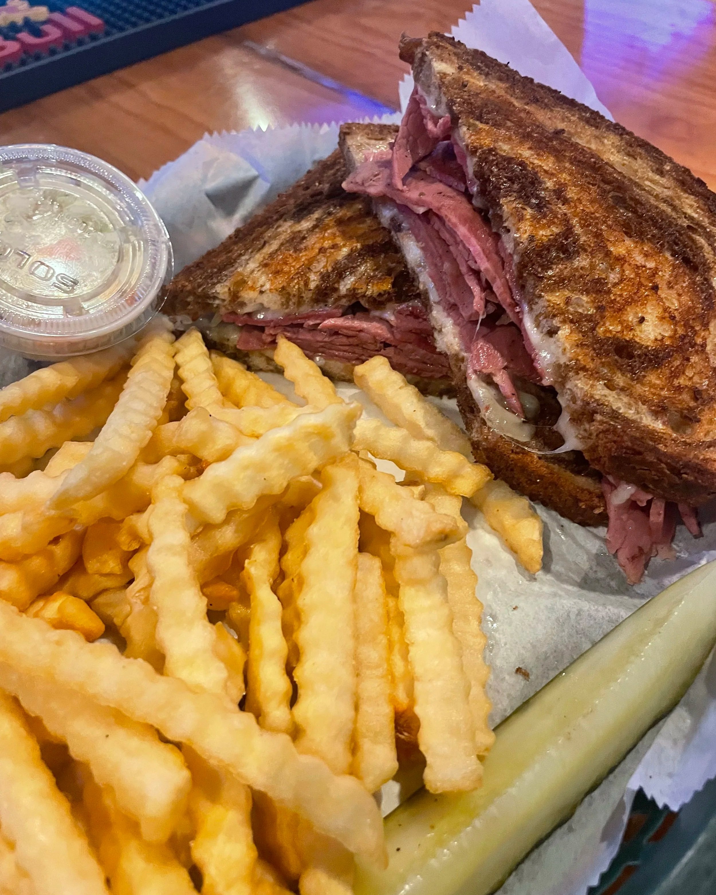 Corned beef, Swiss, Sauerkraut & Thousand Island Dressing on Rye Bread. Served with Fries and Coleslaw